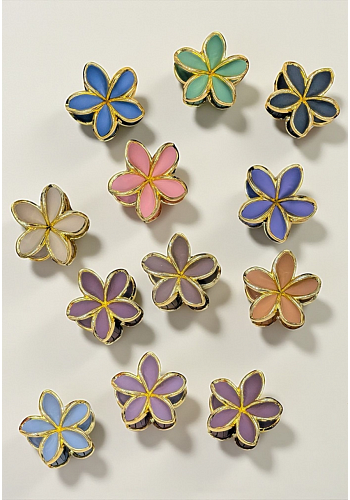 Söta hårklämmor i blomform med gulddetaljer – perfekt för att sätta färg på frisyren! Smidigt mixpack med 12 st i olika nyanser, något för varje look.