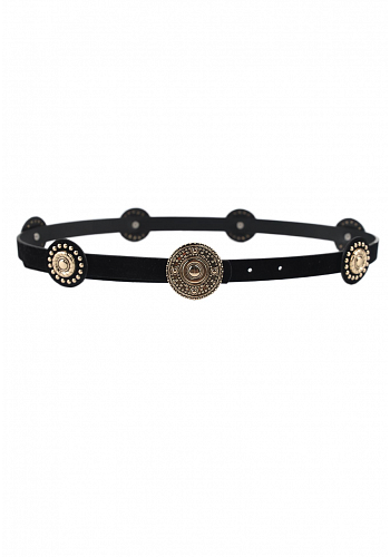 Smalt och dekorativt bälte med cirkulära metallapplikationer som tillför karaktär till både klänningar och byxor – ett statement-accessoar perfekt för höst- och vintersäsongen.