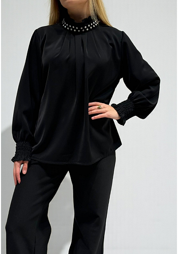 Elegant blus med hög rynkad krage dekorerad med pärlor för en sofistikerad touch. Långa ärmar med smock i ärmslut ger en feminin siluett. Perfekt för både kontoret och festligare tillfällen, en stilren statementblus som lyfter varje look.