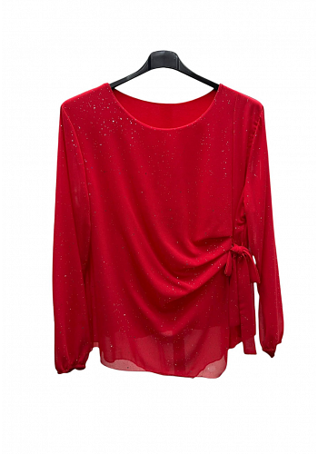 En riktigt härlig chiffonblus med glitterflagor och smickrande sidodrapering. Perfekt både till vardag och fest – ett enkelt sätt att glittra lite extra!