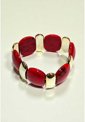 Stilrent och iögonfallande armband med gulddetaljer och marmorerad finish. Elastisk modell som passar de flesta handleder – perfekt att bära både ensam och i kombination med andra smycken.