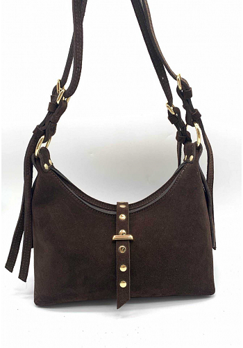 En stilren axelväska i äkta mocka med gulddetaljer och justerbart axelband. Snygg dekorrem framtill som ger väskan en exklusiv touch – perfekt till både vardag och fest!