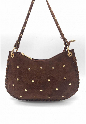 Trendig axelremsväska i äkta mocka med guldfärgade nitar och flätad kant. Väskan har både kort och lång rem, vilket gör den mångsidig och perfekt för alla tillfällen.