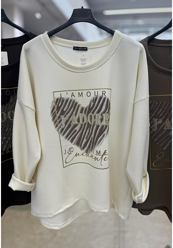 Mjuk och följsam tröja med tryckt hjärtmotiv och text i skimrande detaljer. Den rundade halsringningen, nedhasade axlarna och den avslappnade passformen gör den perfekt för en bekväm vardagslook – enkel att bära till jeans, leggings eller kjol.