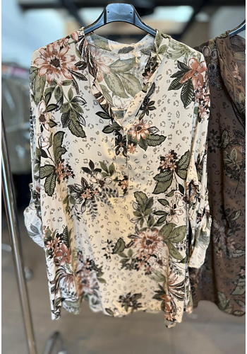 Blus med vackert blommönster och diskreta leopardfläckar, en kundfavorit som snabbt blir en go-to i garderoben. Uppvikbara ärmar.