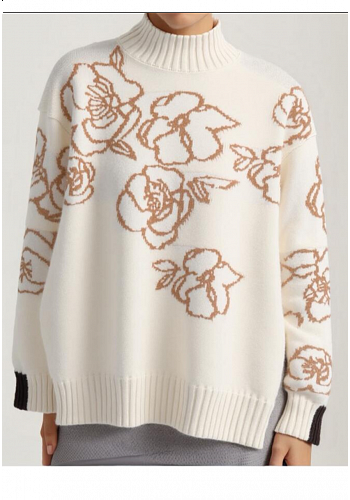 Elegant stickad tröja med höstblommor i kontrastmönster – en stilren favorit för säsongens garderob. Modellen har en något boxig passform med ribbstickade avslut och högre krage för extra värme.