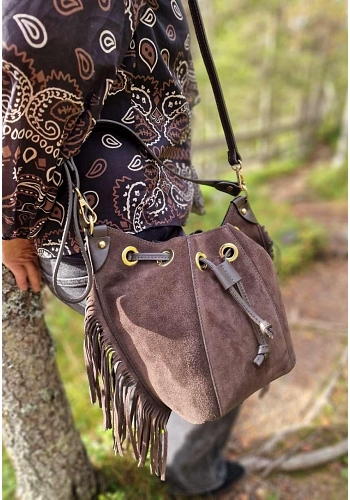 Trendriktig bucket bag i äkta mocka med dekorativa fransar och snygga metalldetaljer. Stängs med dragsko – perfekt både till vardags och till festen!