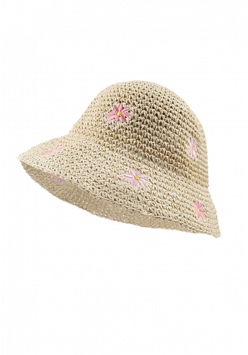 Charmig och trendig virkad hatt med broderade blommor som ger en feminin och lekfull look. Perfekt för vår- och sommarsäsongen – både som solskydd och stilfull accessoar.