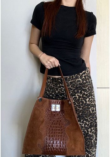 Elegant och rymlig shopperväska i äkta mocka med präglad croco-front för ett exklusivt uttryck. Väskan har dubbla handtag och en stadig konstruktion med säker låsdetalj i metall. Perfekt som vardagsväska för en stilmedveten kund som vill ha både funktion och fashion.