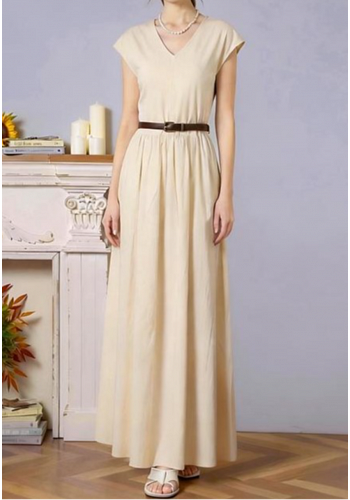 Stilren maxiklänning med v-ringning, mjukt fall och dekorativt bälte i midjan. En elegant och bekväm modell som passar perfekt till sommarens alla tillfällen – från vardag till fest.