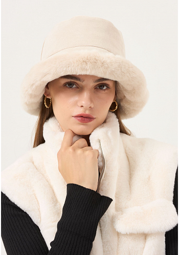 Varm och trendig bucket hat i mockaimitation med fuskpäls. Ett perfekt statement-plagg för kyliga dagar – lika snygg i stan som på fjället.