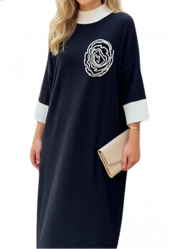Elegant finstickad klänning med dekorativ blomapplikation på bröstet samt kontrastfärgade ärmslut och krage. En feminin och bekväm modell som passar både till vardag och mer uppklädda tillfällen.