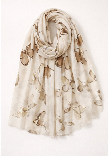 Lätt och luftig scarf med dekorativt fjärilsmönster och fina gulddetaljer. En feminin och elegant accessoar som lyfter varje outfit – perfekt för både vardag och fest.