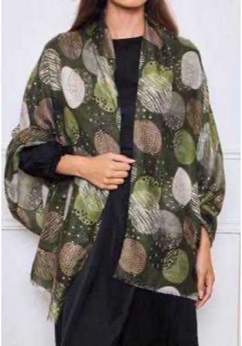 En tunn men täckande höst- och vinterscarf i ett geometriskt cirkelmönster med subtil glans från guldiga tryck. Den blandade bomulls-/viskosblandningen gör den mjuk, följsam och lätt att drapera. Perfekt för både vardagsbruk och att addera ett glittrande inslag i outfiten.
