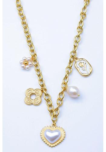 Ett vackert och detaljrikt halsband med berlocker i form av blomma, pärla, hjärta och blomstämpel. Den tjocka kedjan i guldfärg ger ett lyxigt intryck, medan pärldetaljerna adderar en romantisk touch.