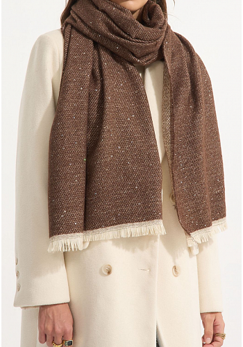 Mjuk och varm halsduk med subtil glittrande effekt och franskant, perfekt för både vardag och fest under kyliga dagar.