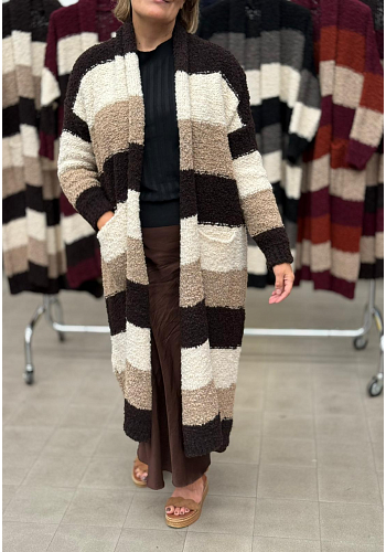 Mysig långkofta i härlig stickad kvalitet med breda blockränder och fickor framtill. En perfekt följeslagare för kyligare dagar – både snygg och varm!