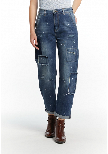 Avslappnad jeansmodell med unika patch-detaljer, sliten look och uppvikta benslut – en statementbyxa med både edge och komfort.