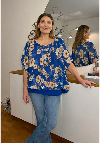 Otroligt omtyckt och populär chiffongtopp i vackert blommönster. Modellen har ett fastsytt underlinne i mjuk viskos och ett luftigt chiffonglager ovanpå. Den breda mudden nedtill gör att toppen sitter snyggt och kan regleras efter önskad passform – vilket gör att den passar många olika kroppstyper.