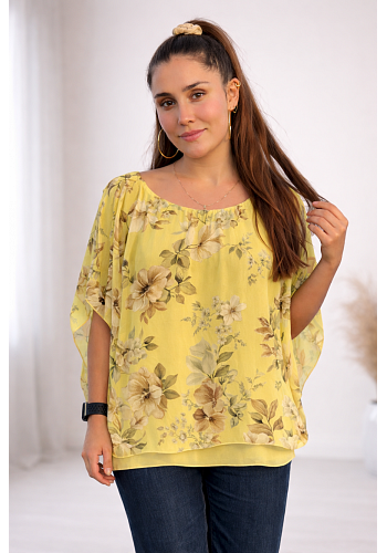 Riktigt omtyckt chiffongtopp med vackert blommönster. Modellen har ett luftigt ytterlager i chiffong och ett mjukt fastsytt underlinne i viskos med elastan för extra komfort. Den breda mudden nedtill gör toppen justerbar och ger en smickrande passform som passar många.