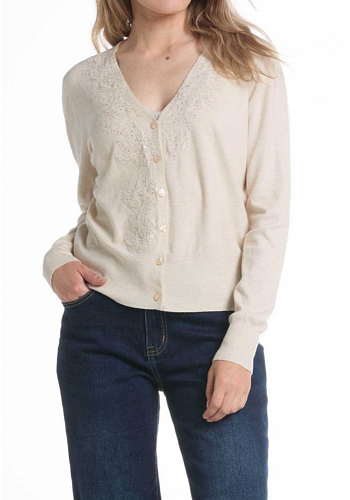 Elegant kofta med V-ringning och knappstängning framtill. Dekorerad med spets och pärldetaljer som ger en feminin och sofistikerad känsla. Perfekt att styla både till vardag och fest.