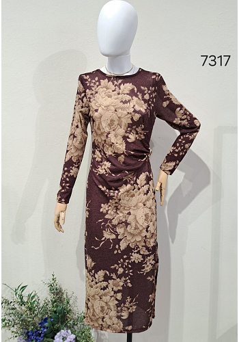 Detaljer: Kroppsnära modell med vackert blommönster, rund halsringning och ett stilrent spänne i sidan som skapar en smickrande drapering.