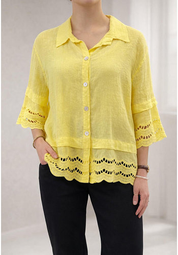 Luftig och stilren linneblus med klassisk krage och knäppning framtill. Dekorativ brodyrkant nedtill och vid ärmslut ger en feminin och somrig känsla – perfekt till både byxor, jeans och kjol.