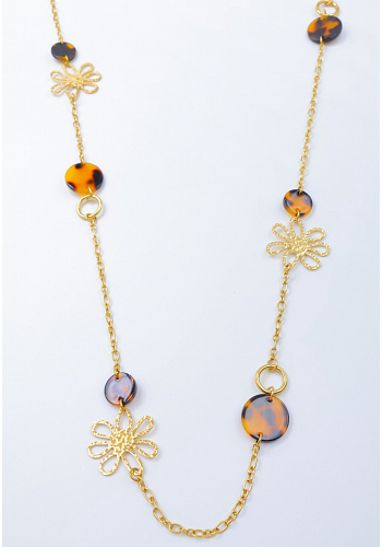 Elegant långt halsband med detaljer i sköldpaddsmönster och blommor i guld. Ett tidlöst smycke som passar både till vardag och fest.