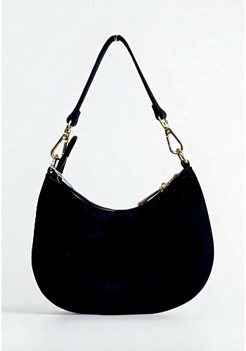 Elegant mindre axelväska i mjuk mocka och äkta italienskt läder. Praktisk dragkedja, avtagbar axelrem och en stilren design som passar både till vardag och kväll.