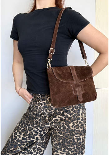 Stilren axelväska i mjuk italiensk mocka med elegant lockdesign och dekorativ rem. Lätt och smidig att bära med justerbar axelrem, guldfärgade metalldetaljer och dragkedja under locket. Perfekt som vardagsväska eller till kvällen för en diskret men chic touch.