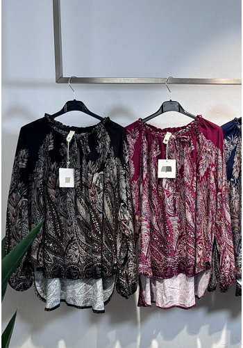 Lätt och luftig blus i mönstrat tyg med resår i halsringningen för en bekväm passform. Perfekt att styla både till vardags och fest.