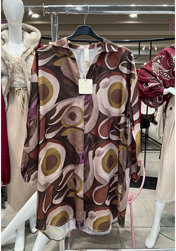 En luftig klänning/tunika i ett retroinspirerat mönster med svepande former och varm färgskala. Modellen har en avslappnad siluett, skjortkrage och långa ärmar. Det sköna tyget ger både komfort och rörelsefrihet, vilket gör plagget till en självklar favorit för höstens kollektioner.