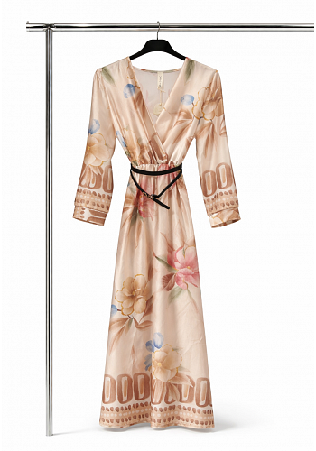 Elegant långklänning i vackert mönster med lätt omlottmodell. Medföljande midjeskärp framhäver midjan och ger en feminin silhuett – perfekt för både vardag och fest.