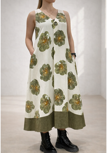Luftig klänning med vackert blommönster och dekorativ knappdetalj. Bekväm passform i mjuk bomull – perfekt för både vardag och sommarbruk.