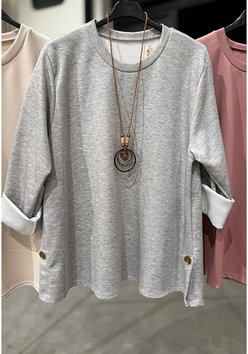 Detaljer: Dekorativa guldfärgade knappar i sidorna och medföljande halsband. Skön, stretchig kvalitet med uppvikta ärmar och ledig passform – en vardagsfavorit med det lilla extra.