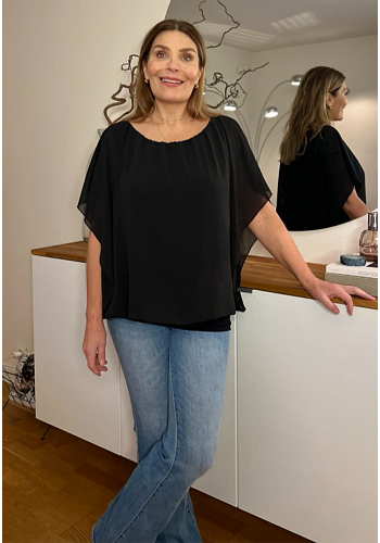 Luftig och elegant blus med transparenta fladdriga ärmar och ett mjukt stretchigt viskoslinne som sitter fast undertill. Perfekt för både vardag och fest, lika snygg till jeans som till kjol.