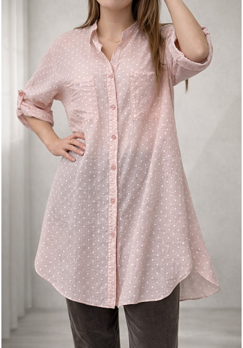 En tunn och sval skjortklänning i mjuk bomull med ett klassiskt prickigt mönster som ger ett lekfullt men stilrent uttryck. Den luftiga passformen och det lätta tyget gör den perfekt för varmare dagar – bär den som klänning, öppen som ett lätt lager eller tillsammans med byxor.