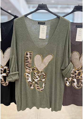 Snygg och bekväm baströja i v-ringad modell med glittrigt "LOVE"-tryck i leopardmönster. Avslappnad passform som gör sig lika bra till jeans som leggings, ett uttrycksfullt vardagsplagg med attityd.