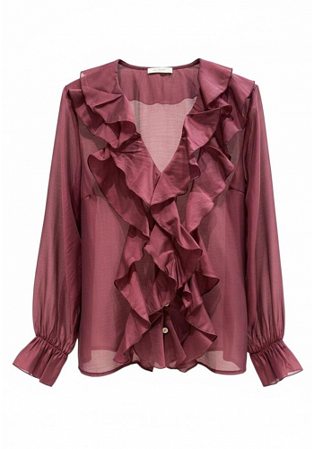 En V-ringad kråsblus med lätt glans och subtil transparens – feminin, luftig och elegant.