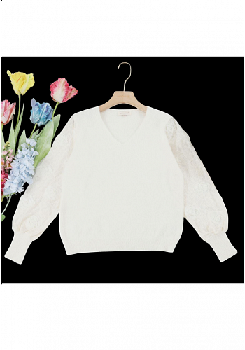 Mjuk och fluffig tröja med romantiska spetsärmar dekorerade med blommor. V-ringad modell som funkar lika fint till jeans som kjol.