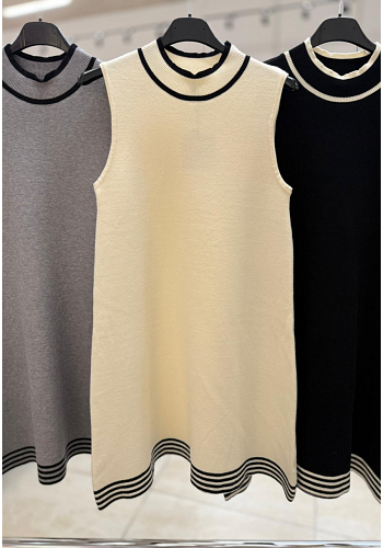 Stickad ärmlös klänning med kontrasterande ränder vid halsringning och fåll. En sportigt elegant modell som fungerar lika bra till vardags som till uppklädda tillfällen.