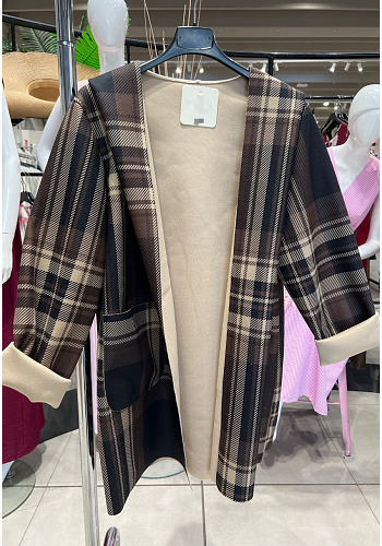 Stilren cardigan i mjuk stretch med rutig design och uppvikta ärmslut – perfekt att slänga över varje outfit.