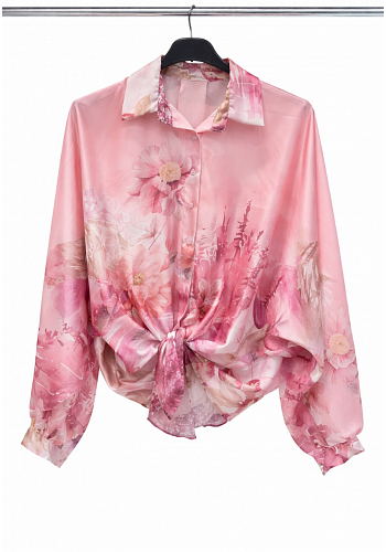 Elegant satinblus i glansigt tyg med vackert blommönster. Kan bäras knuten framtill eller löst för en mer avslappnad stil.