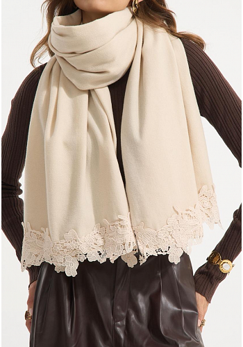 Elegant sjal med vackert spetsbroderi i ändarna, perfekt både till vardags och fest. Lätt, mjuk och följsam med exklusiv känsla.