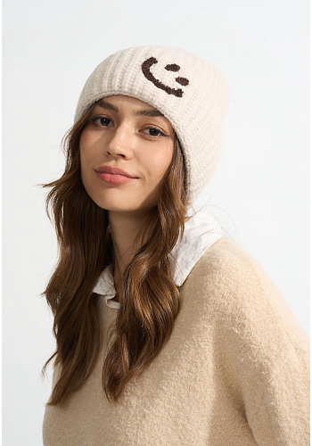 Mysig och stretchig mössa i ribbstickad design med smiley-detalj framtill – en både glad och värmande accessoar för kyliga dagar!
