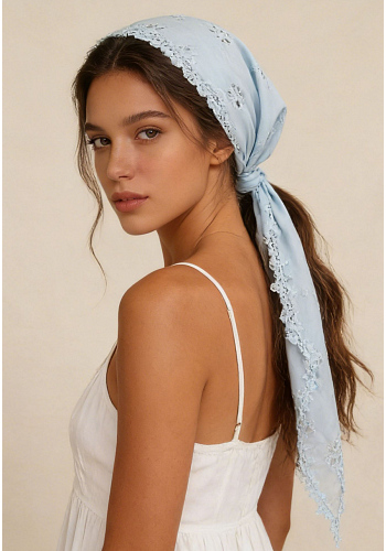Elegant och feminin scarf med vackra spetsdetaljer som kan stylas på flera sätt – i håret, runt halsen eller som pareo. Ett mångsidigt plagg som ger en romantisk och trendig touch till sommarens outfits.