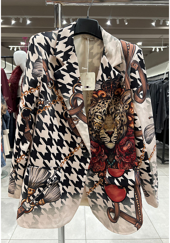 Den här kavajen är inget för den blyga – ett kraftfullt leopardmotiv möter svartvitt hundtandsmönster och kedjedetaljer i ett unikt collage av styrka och stil. Rak modell med klassisk krage, fake–fickdetaljer och lätt stretch i tyget för komfort. Ett iögonfallande tillskott i höstens kollektion, perfekt som fokusplagg för skyltfönster och lookbooks.