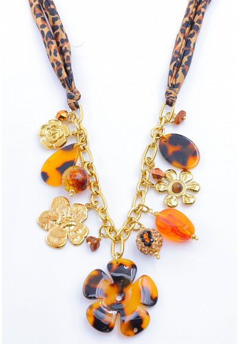Unikt statementhalsband med guldfärgade detaljer, skalmönstrade hängen och blommotiv. Kombinerat med tygrem i leopardmönster för en trendig och iögonfallande look.