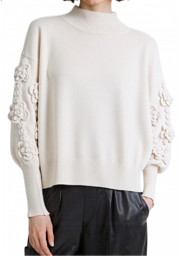 Trendig stickad tröja med dekorativa 3D-blommor längs ärmarna – ett feminint statement för säsongen. Perfekt att styla till både kjol och byxa, från kontor till helg. Mjuk och följsam med lagom struktur i stickningen.