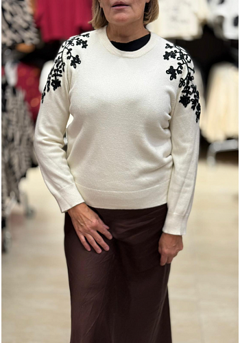 En romantisk stickad tröja med vackra broderade blommor på axlarna. Perfekt till både vardagsjeans och kjol – en fin mix av feminin och klassisk stil med en mjuk och behaglig känsla.